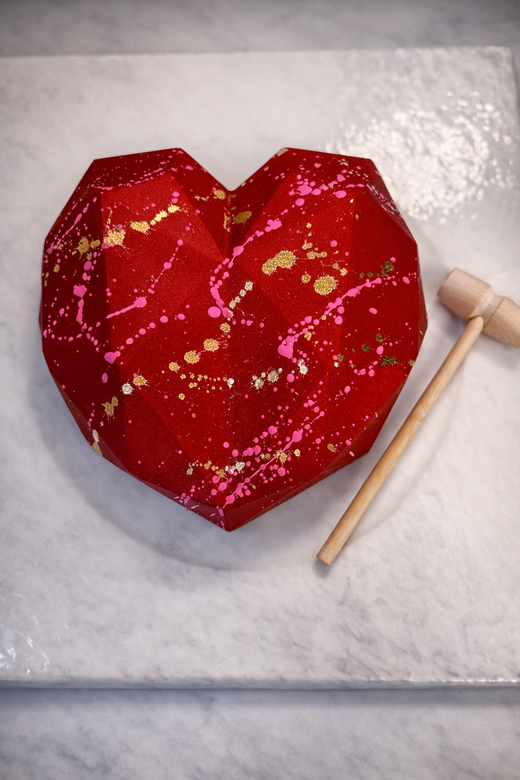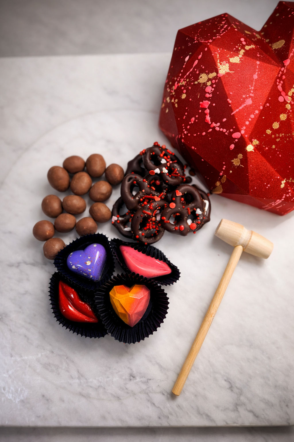 A bold, sculpted chocolate heart filled with Valentine bonbons, chocolate-covered pistachios, and festive chocolate dipped pretzels. Crack it open with the included mallet to reveal the sweet surprise inside. Perfect for gifting, sharing, and making a bold Valentine's statement. Available in red, pink and purple.